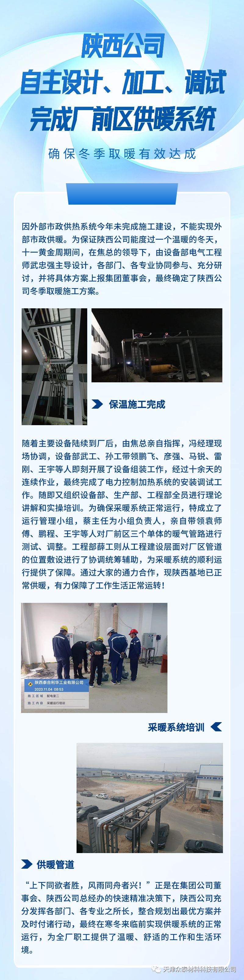 為保證陜西公司能度過(guò)一個(gè)溫暖冬天,十一黃金周期間,在陜西公司焦總的帶領(lǐng)下,由設備部電氣工程師武忠強主導設計,各部門(mén)、各專(zhuān)業(yè)協(xié)同參與、充分研討,最終確定了陜西公司冬季取暖施工方案。通過(guò)大家通力合作,現陜西基地已正常供暖,有力保障了工作生活正常運轉!